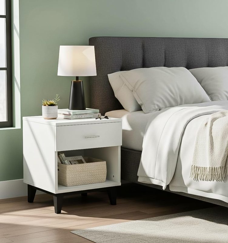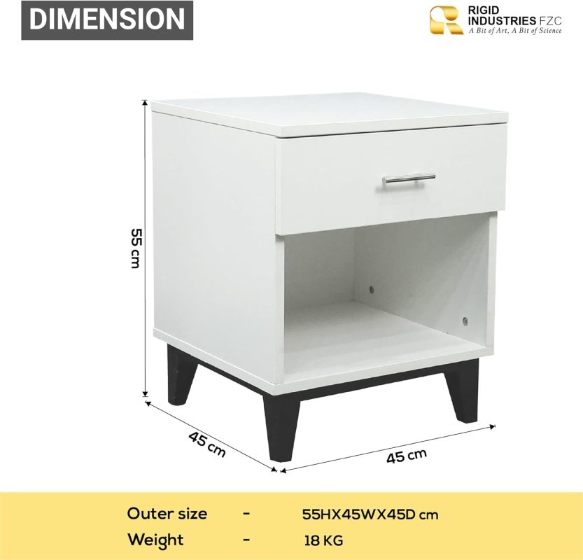 Nightstand Bedside Table | Accent End Table with 1 Drawer MDF Smooth Edges | Bedroom Side Table, Bedside Chest Drawer – White (55H * 45W * 45D Cm)